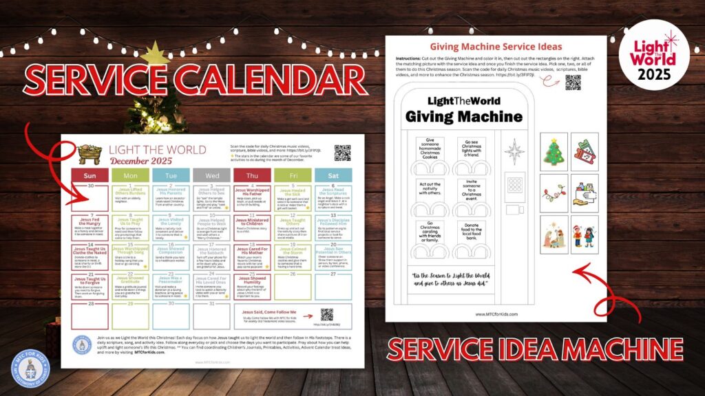 How can you BE a light to the world this Christmas? Join us for 25 days in 25 ways as we learn and do as Jesus Christ did when he was on the earth. Print this simple Light the World Advent Calendar and have fun serving like Jesus did. Pick one service idea to do during December, daily, or weekly. You decide how to best Light the World. Be prayerful as help serve others this Christmas season plus a NEW Giving Machine printable. Cut out the Giving Machine and color it in, then cut out the rectangles on the right. Attach the matching picture with the service idea and once you finish the service idea. Pick one, two, or all of them to do this Christmas season. Scan the code for daily Christmas music videos, scriptures, bible videos, and more to enhance the Christmas season.